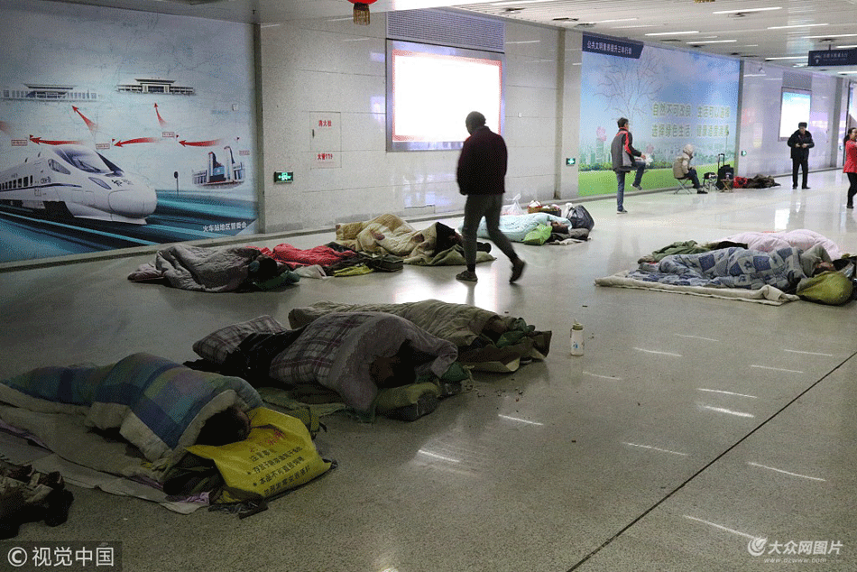 2017年12月18日,鄭州,二七區一處地下通道內,不少進城務工者打地鋪睡覺。據農民工介紹,他們還沒有找到活干,晚上為了省錢就睡在地下通道里,每天早上五點就起床外出找活干。