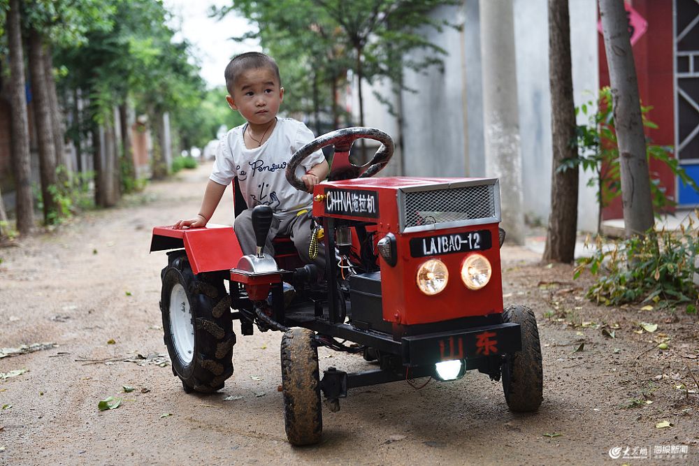 2019年7月7日,在山東省日照經濟技術開發(fā)區(qū)奎山街道西河村,村民宋成軍造了一輛“迷你拖拉機”一時成為村里的新鮮事,每當他的兒子開著這輛“迷你拖拉機”上街玩耍時,都會吸引人們的圍觀。宋成軍說:“回頭率百分之百。”