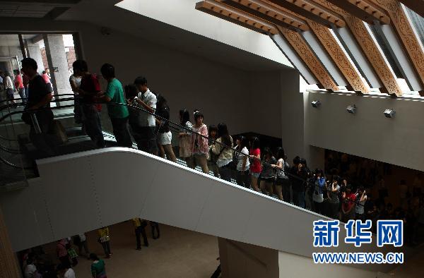 7月2日,游客乘坐電梯準(zhǔn)備開始參觀。臺北故宮博物院藏品共約60萬件,分為書法、古畫、碑帖、銅器、玉器、陶瓷、文房用具、雕漆、琺瑯器、雕刻、刺繡及緙絲、圖書、文獻(xiàn)等14類。博物院經(jīng)常維持有5000件左右的書畫、文物展出,并定期或不定期舉辦各種特展,每天都吸引眾多參觀者。新華社記者 費茂華 攝