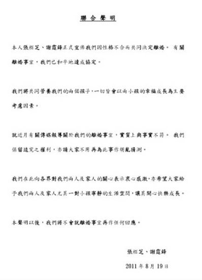本人張柏芝、謝霆鋒正式宣布我們因性格不合而共同決定離婚。有關離婚事宜,我們已和平地達成協定。
